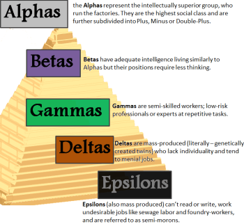 So in addition to genetic editing to sort embryos into five castes (Alpha—the leadership class, Beta, Gamma, Delta and Epsilon, each with further Plus and Minus side-groupings, see Fig. 14), the World State in Brave New World further relies on technology to generate up to 96 genetically identical lower-caste embryos from a single fertilized egg. The embryos then are subjected to Henry Ford-inspired assembly-line chemical treatments to enhance the desired and suppress the undesired characteristics for the destination caste: “…that is the secret of happiness and virtue – liking what you’ve got to do. All conditioning aims at that: making people like their unescapable social destiny.”
