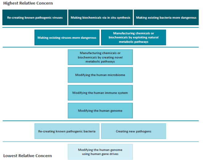 The U.S. National Academy of Sciences has put together a framework for assessing the threat posed by potential synthetic bioweapons (see Fig. 12). The panel ranked threats based on their assessments of four basic criteria: usability of the technology; usability as a weapon; requirements of actors; potential for mitigation. They list three possibilities as the ones of most severe concern: the re-creation of known pathogenic viruses; fabrication of biochemicals via in situ synthesis; and making existing bacteria more dangerous. These three concerns are among the simplest applications of genomic editing, especially via CRISPR-Cas9. According to a post by Nicholas Cropper: “Making existing bacteria more dangerous and altering organisms to produce different biochemicals are common lab practices around the world today. Recreating known viruses sounds difficult, but in 2002 scientists successfully recreated the Polio virus from only the publicly available genome and mail-order biomolecules. That experiment was conducted before the discovery of CRISPR-Cas9 and the method has only become easier in the intervening years.” In addition, one must consider the possibility that the genome of recreated viruses could be edited to generate resistance to previously developed vaccines or treatments.