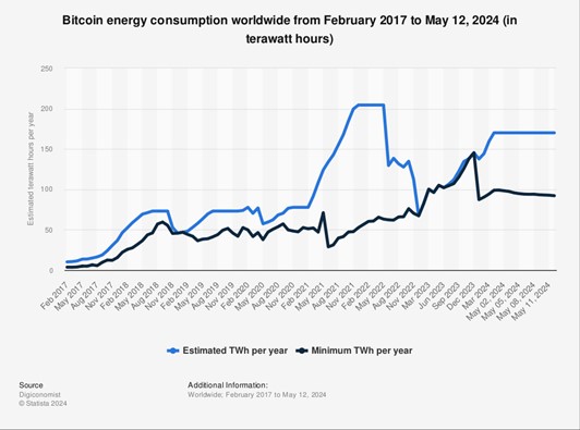 So, how much energy is currently being used in cryptocurrency data mining? Figure II.2 shows the average global use of electrical power in Bitcoin mining vs. time, in Gigawatts (a Gigawatt is one billion Watts or 109 Watts) over the past five years. One can see that the rate of power usage has increased by a factor of four in just five years, or a 62% increase year by year in power usage. Figure II.3 shows the banks of computers in one Bitcoin mining farm. Figure II.4 shows the worldwide Bitcoin energy consumption in the past five years, in Terawatt-hours (TWh, where 1 Terawatt is one trillion Watts, or 1012 Watts). The blue curve is the estimated global energy consumption, which rises from about 10 TWh in 2017 to 150 TWh in 2024. (The 2024 estimate is to be compared to the estimate of 200 TWh for all cryptocurrency mining indicated in Fig. I.2.) The graph includes both the estimated energy consumption per year, and also the minimum energy consumption; this is because at present, estimates of energy consumption in crypto mining have large uncertainties. The energy consumption increases rapidly each time the Bitcoin reward is halved and also whenever the Bitcoin value is surging.