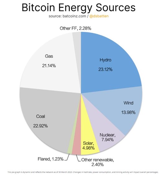 It should be noted that these figures have changed significantly in recent years. Until the middle of 2021, the country with the largest crypto mining industry was China. However, in June 2021 China closed down most of its crypto mining activities, as Chinese officials realized that the large expenditure of energy in cryptocurrency was interfering with their climate change target of becoming carbon-neutral by 2060. As a large fraction of China’s energy usage came from coal burning, the fraction of crypto energy expenditure from burning coal will decline, while in the past few years crypto mining has increasingly relied on renewable energy sources.