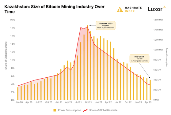 As a result, cryptocurrency miners flocked to that state, and in October 2021 the hashrate index (a measure of the amount of energy consumed in crypto mining) in Kazakhstan reached 18% of the world’s total; at that point the country was second in the world. However, Kazakhstan subsequently experienced a crisis as it was unable to handle the greatly increased demand for power. Eventually, the country began rationing energy. As a result, Bitcoin miners packed up and left that country, so that by May 2023 their share of the global hashrate had decreased to less than 4%. This is shown in Fig. II.9, which plots the cryptocurrency power consumption and global hashrate share in Kazakhstan from Jan. 2020 to May 2023. The solid curve (and left-hand axis) shows the percentage of the global hashrate in Kazakhstan, while the orange bars (and right-hand axis) plot the power consumption in MegaWatts. The two quantities are very closely, but not perfectly, correlated. It can be seen that the power consumption peaked in Oct. 2021, while by May 2023 it had dropped by nearly a factor of four from its peak.