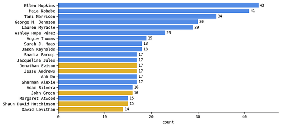 The common themes of the recent book bans and the most frequently banned authors are indicated in Figs. IV.4 and IV.5, respectively. 75% of the most banned authors identify as women, non-binary, or people of color. Frequently banned topics include: discussions of gender, sexuality and transgender experiences, or books featuring prominent LGBTQ characters; books about racism and Black history, including slavery, or just containing prominent characters of color; books about Muslim experiences in America; works on abortion and women in science and mathematics; books about activists’ fight for rights. These are the topics American conservatives do not want their children exposed to. The banned books are chosen to narrow education or exposure about topics that do not fit within an outdated conception of America as an exceptional, prim, white, male-dominated, Christian society, where women are not encouraged to explore non-traditional roles and deviations from traditional heterosexuality are to be kept silent.