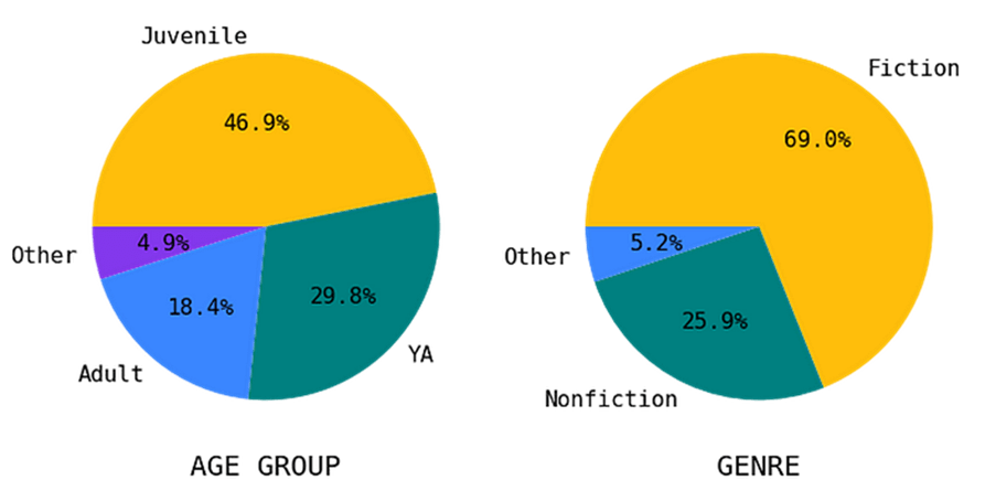 The banned books were mostly written after the year 2000 for juvenile and young adult audiences, as indicated in Fig. IV.3. Among banned books published before 2000 are Toni Morrison’s The Bluest Eye and Beloved, Art Spiegelman’s graphic novel about the holocaust Maus, and Kurt Vonnegut’s Slaughterhouse Five.