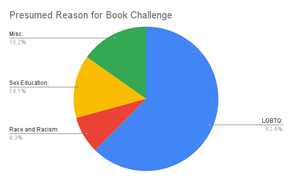 The ongoing surge in book bans in American school and public libraries largely bears on the question of who we are as Americans. It is mostly driven by a small number of conservative activists and politicians, who are reacting against myriad attempts by a number of minority groups and individuals to be included as important parts of American history and the American public. Its advertised goal, although seldom stated quite so bluntly, is to ensure that heterosexual, white Christian children are not made to feel “uncomfortable” by discussions of people not like them or of problems that they presumably do not share. For example, in 2021 a Republican Texas state legislator launched an investigation into 850 books that “might make students feel discomfort, guilt, anguish, or any other form of psychological distress because of their race or sex.” The categories of books he challenged are summarized in the pie chart of Fig. IV.1.