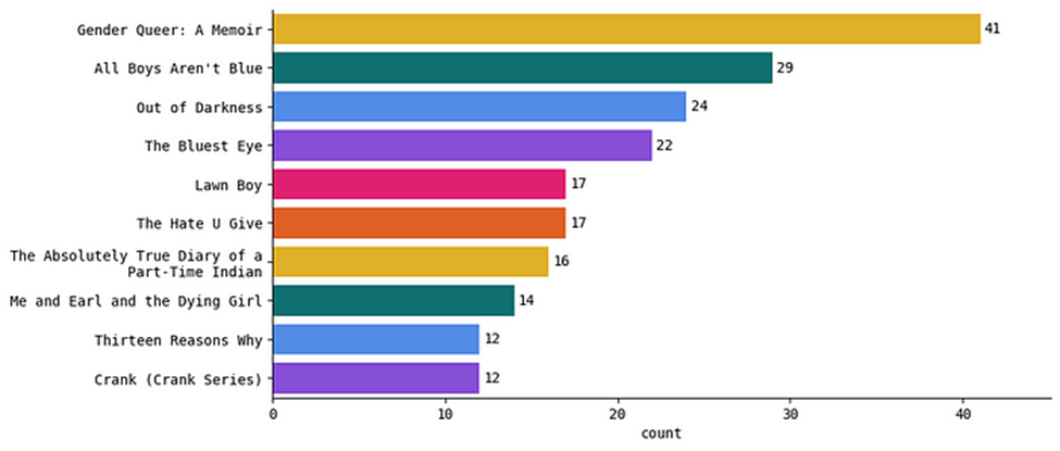 Yennie Jun has carried out a detailed analysis of U.S. school library and classroom book bans during a one-year period beginning on July 1, 2021, using PEN America’s Index of School Book Bans dataset. The dataset, which may not capture all bans during the period, includes 1,648 unique books written by 1,261 different authors. The distribution of bans among states was shown in Part I in the map of Fig. I.2. The ten books banned in the most school districts are shown in Fig. IV.2.