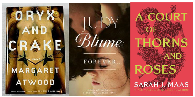 Figure 2: Three of the 13 books that have been banned from all public school libraries in Utah, under the criteria established in HB29. From L: Oryx and Crake by Margaret Atwood; Forever … by Judy Blume; A Court of Thorns and Roses by Sarah J. Maas.