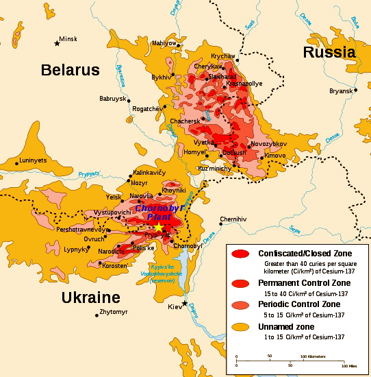 Figure IV.7: A map of the area surrounding the Chernobyl nuclear plant, showing the levels of radioactivity as of 1996. The units of radioactivity are Curies/km2. The different colors denote in order of decreasing radiation the Confiscated Zone, the Permanent Control Zone, the Periodic Control Zone, and the Unnamed Zone. At present the areas inside the Exclusion Zone remain forbidden for people to live in or enter; however, it is estimated that roughly 200 samosely (returnees) have re-entered the Exclusion Zone and currently live there. Surrounding the Exclusion Zone are areas that were designated for voluntary resettlement once the radiation had died down sufficiently. However, those areas have never been reopened.