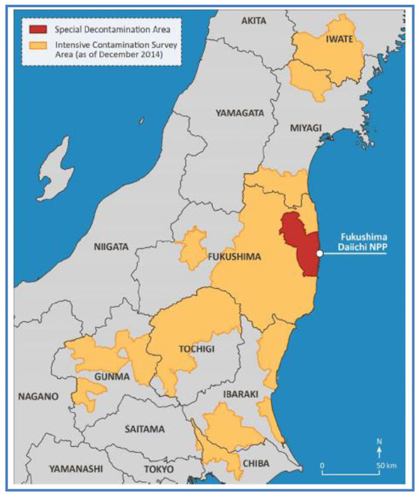 Immediately following the inundation of the Fukushima reactor complex, the Japanese government evacuated citizens from the immediate area. Eventually, 160,000 people were temporarily relocated from the area. Figure IV.12 shows the relocation areas around the Fukushima plant. The red area is the “Special Decontamination Area (SDA);” it is estimated that individuals in this area could receive 10 mSv (milli-Sieverts) of radiation per year. For calibration, that level corresponds to 20% of the maximum annual whole-body radiation dose the U.S. Nuclear Regulatory Commission allows for radiation workers. A second area (shown in yellow) is the “Intensive Contamination Survey Area (ICSA);” in the ICSA area, individuals could receive 1 mSv of radiation. In the ICSA area, municipalities are responsible for determining their own disposition of contaminated areas, with support and advice from the federal government.