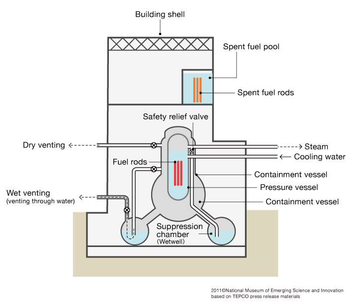 The Fukushima reactors had various backup safety systems. The steel reactor vessel itself, called the dry well, was designed to withstand a great deal of pressure. Should the reactor vessel be breached, it was connected to wet well suppression pools (shown at the bottom of the containment building in Fig. IV.11). The wet well was connected to the reactor vessel through a series of vents. If a LOCA occurred, steam at high pressure would be released from the reactor vessel through a series of pipes and relief valves. The steam would then condense in the suppression pools.