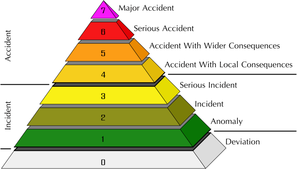 Figure IV.3: The International Nuclear Event Scale. The levels are defined in numbers ranging from 0 to 7, where 7 (the top level) is the most serious. The lowest three levels, called incidents, are defined as 0 = Deviation; 1 = Anomaly; 2 = Incident; 3 = Serious Incident. The top four levels are called accidents, with 4 = Accident with Local Consequences; 5 = Accident with Wider Consequences; 6 = Serious Accident; 7 = Major Accident.