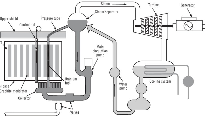 Figure IV.5: A schematic diagram of the RBMK reactor. Fuel bundles contained enriched uranium, with graphite moderators and control rods that could be raised and lowered to control the rate of the fission reaction. Water was injected into the bottom of the reactor vessel; as it rose, it was converted to steam. The steam was sent through a turbine that powered a generator. The steam was then sent through a condenser and the water was returned to the reactor.