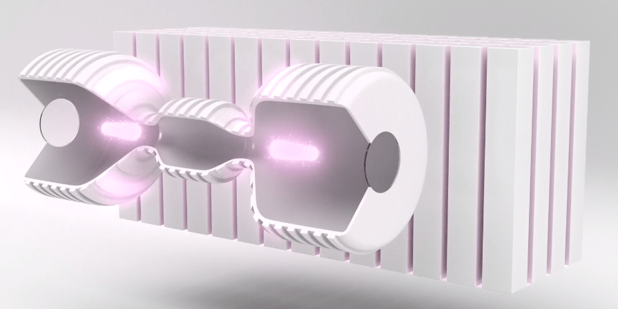 Helion’s plasma accelerator, pictured in Fig. VI.17, is also designed to eliminate the need for tritium and the production of neutrons, but by using D-3He fusion (see the red curve in Fig. V.1):