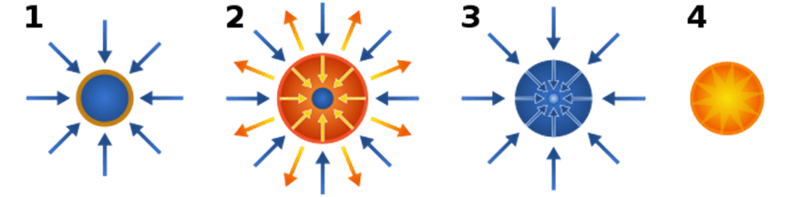 3. During the final part of the capsule implosion, the fuel core reaches 20 times the density of lead and ignites at 100,000,000 ˚C.