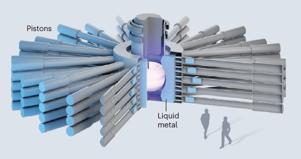 Several companies are developing novel, non-Tokamak, approaches to magnetic confinement, with a focus on addressing the tritium fuel shortage. General Fusion is attempting a magnetized target reactor, still using D-T fusion, but in the very different configuration shown in Fig. VI.15. Here, the plasma resides within a cavity generated inside a liquid metal target by spinning it rapidly with a centrifuge. Then, in a series of pulses, once per second or so, the elaborate piston system pictured pumps more liquid metal into the chamber, compressing the cavity and the plasma inside over a few tens of milliseconds, during which conditions for fusion could be attained. By including liquid lithium in the liquid metal material, more tritium would be produced in place via neutron bombardment every time fusion reactions proceed, improving on the Tokamak design, where the lithium blanket lies further from the fusing fuel.
