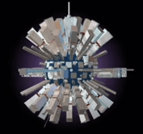The 192 lasers at NIF deliver about 500 trillion watts of power (in comparison, a typical laser pointer delivers less than 5 thousandths of a watt) to the hohlraum, but only over a few nanoseconds, delivering a total energy of 1.8 million Joules. The arrangement of the laser ports around the target chamber is shown in Fig. VI.5, along with the inside of the chamber containing the hohlraum and its microcapsule at the center. The cost of building the NIF facility was over $3 billion U.S. The generation of all that laser power and the process of inducing the burning plasma are illustrated in a video animation, from which a still image is shown in Fig. VI.6.