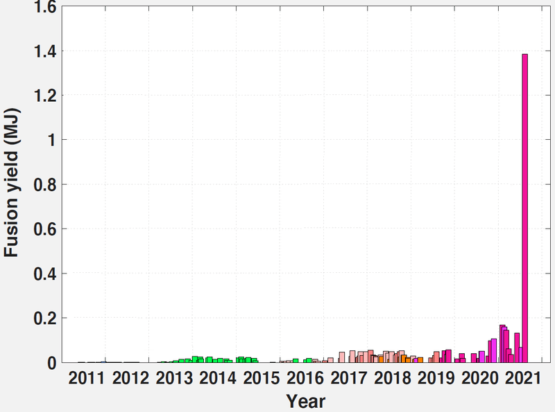 NIF has produced a burning plasma, but not yet break-even ignition, where energy produced begins to exceed energy input. But after many years of setbacks and improvements, they recently (August 2021) attained the breakthrough indicated in Fig. VI.7, producing 1.3 million Joules of output energy, an order of magnitude higher than they had attained previously. They did not yet achieve break-even, since the output energy was about 70% of the total laser input energy. While not yet break-even, this breakthrough is one of the developments that has led to renewed enthusiasm for future prospects of fusion energy.
