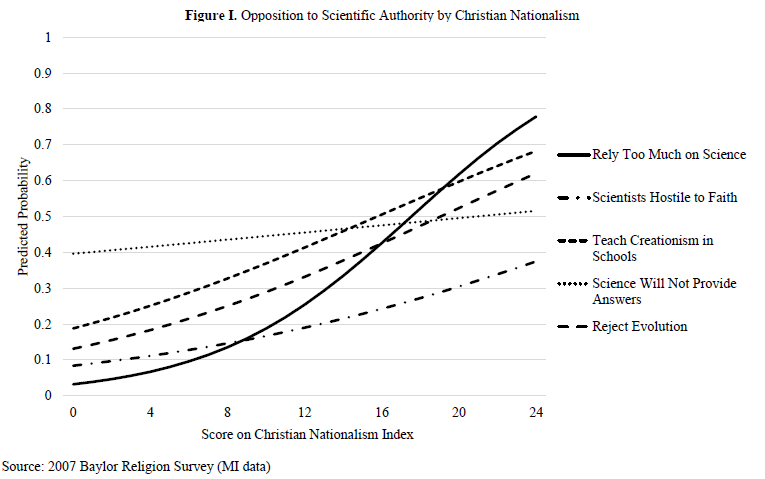 The Christian Nationalist movement goes beyond mere fundamentalist faith in religion to the desire to see Christianity installed as the established religion in the U.S., in direct opposition to the existing Establishment Clause in the U.S. Constitution, which forbids such a state religion. The Christian Nationalists, who now form a critical part of the Republican voter base and power structure, want to see the Bible established as the ultimate moral authority in U.S. culture and justice, superseding secular laws passed by State or Federal legislatures. Theirs is a rather exclusive version of Christianity which contains “hierarchical assumptions about race, gender, nationality, and sexuality.” A recent analysis carried out by Baker, Perry, and Whitehead demonstrates that belief in Christian Nationalism as a governing principle is strongly correlated with strong distrust in, or outright opposition to, science and scientists. Baker, et al. analyze results from the 2007 Baylor Religion Survey in which Gallup polled 1,648 Americans with a significant sample of questions assessing religious beliefs, behaviors, and attitudes. They determine a “Christian Nationalism Index” by combining responses about level of agreement with the following six statements: