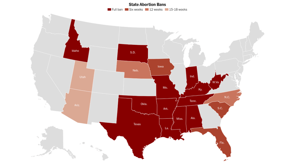 Since the Supreme Court’s 2022 decision that revoked the protection for abortion established in the Roe v. Wade case, a number of states have adopted or reinstated abortion bans. Figure V.5 shows the states that have these bans. The darkest shade of maroon denotes those states that ban abortion from the date of conception (despite the fact we have pointed out in a previous post that conception as an event cannot be detected in vivo); the next lighter shade denotes states that have an abortion ban beginning at six weeks of pregnancy (Iowa, South Carolina and Florida); the next lighter shade denotes states that have a ban beginning at 12 weeks (Nebraska and North Carolina); and the lightest shows Utah and Arizona, where the abortion ban begins at 15 – 18 weeks.