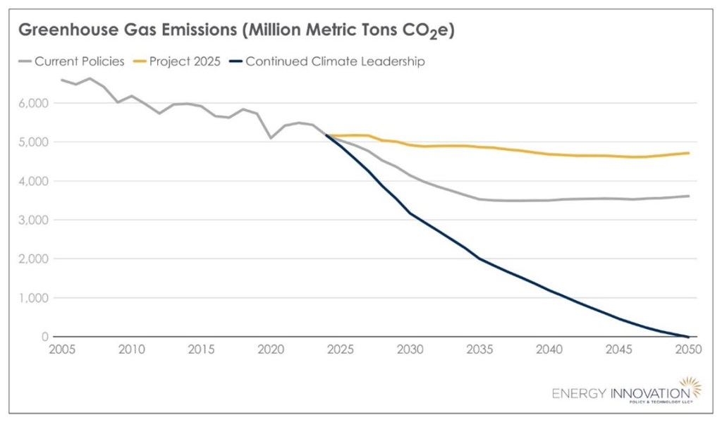 Figure V.4 shows the Energy Innovation projections of greenhouse gas emissions (GGE) up to the year 2050. The grey curve shows projections for GGE, in millions of metric tons of CO2, under the 2022 Inflation Reduction Act. The dark blue curve shows projections if climate plans proposed by Harris-Walz are implemented. The amber curve shows the change in GGE as recommended under Project 2025. It is clear that the Project 2025 recommendations would result in five times the GGE emissions in 2040; and by 2050 the Harris-Walz climate plan envisions a path leading to zero GGE. We remind readers that carbon dioxide remains in the atmosphere for many decades and failure to curb GGE by mid-century will cause global temperatures to rise to dangerous levels.
