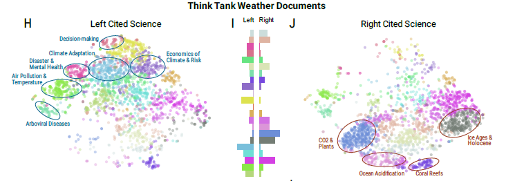 The Furnas, et al. analysis indicates that Democratic-led committees and left-leaning think tanks are more likely than their Republican-led counterparts to cite “hit” science papers that have among the top 5% of research citations in their field and year. But it also reveals systematic differences in the scientific topics cited in Democratic vs. Republican policy documents. This difference is illustrated in Fig. VI.3 by a clustering algorithm that distinguishes scientific topics related to weather and climate that are cited in left-leaning vs. right-leaning think tank documents. “Left-of-center think tanks tend to rely on science around the topics of the economic costs of climate change, climate resilience and adaption, mental health and [climate-related] disaster, and air pollution and temperature…whereas right-of-center think tanks are much more likely to cite science about the effects of elevated CO2 on plants, ocean acidification, prior ice ages, and Holocene climate patterns.”