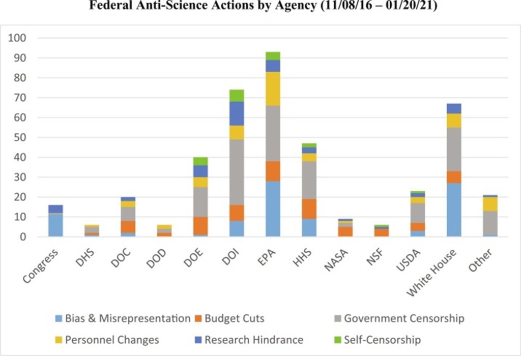 The anti-science proposals from Project 2025 mirror and amplify actions taken during the first Trump administration to undermine science. These actions are documented in the Silencing Science Tracker, an online database that records anti-science actions taken by the federal, state, and local governments. The Silencing Science Tracker is a joint effort by the Sabin Center for Climate Science Law at Columbia University, and the Climate Science Legal Defense Fund. “It tracks government attempts to restrict or prohibit scientific research, education or discussion, or the publication or use of scientific information, since the November 2016 election.” The tracker reported that between the date of Trump’s election in November 2016 to President Biden’s inauguration in January 2021, 346 anti-science actions were taken by the federal government. The anti-science actions during the Trump administration are shown in Fig. V.6. Those actions that occurred between Nov. 8, 2016 and Jan. 20, 2021 are broken down by government agency, and also by the type of action taken. Bias and misrepresentation are shown in light blue; personnel changes are shown in yellow; budget cuts are colored orange; research hindrance in blue; government censorship in grey; and self-censorship in green. If Trump is elected in 2024, we can expect many more such actions if the proposals in Project 2025 are enacted, and if scientists are replaced by Trump loyalists in all of these agencies.