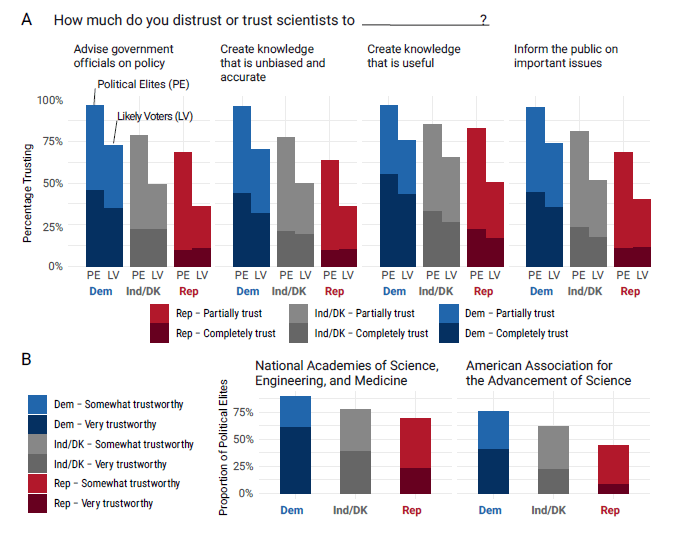 The surveys referenced in the earlier sections all probed general public attitudes among Americans. It is interesting to probe the extent to which the partisan divide among voters in the level of trust in science and scientists is reflected among recent political leaders. Furnas, LaPira, and Wang have done that in a recent article entitled Partisan Disparities in the Use of Science in Policy. As part of their research these authors conducted a survey “of roughly 3,500 US political elites and public servants (e.g., congressional staffers, bureaucrats, political journalists, lobbyists, non-profit advocates and association leadership, corporate C-suite executives, judges and clerks, and state and local government officials) [and]…a contemporaneous survey of roughly 1,000 likely voters.” They asked all respondents to assess their level of trust in scientists to: advise government officials on policy; create knowledge that is unbiased and accurate; create knowledge that is useful; inform the public on important issues. They also asked the political elites to assess whether two specific scientific advisory organizations — the National Academies of Science, Engineering, and Medicine (NAS) and the American Association for the Advancement of Science (AAAS) – were trustworthy as sources of information relevant to public policy.