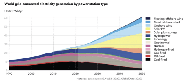 Since energy production is the economic sector that currently produces the most greenhouse gases, it is also the one most important to reform. Fossil fuel industry agents and supporters like to claim that renewable sources cannot meet the world’s energy demand, but this need not be true. Figure III.1 shows that the fraction of the world’s electricity production provided by renewables reached 30% in 2023 and is rapidly growing, thanks to the rapid rise in solar and wind power (the green band in Fig. III.1). The projections shown in Fig. III.2 indicate that the carbon-free combination of renewables and nuclear energy can provide over 90% of worldwide electricity demand by mid-century. That assumes that humans, and especially AI, can temper their growing appetite for more and more power.
