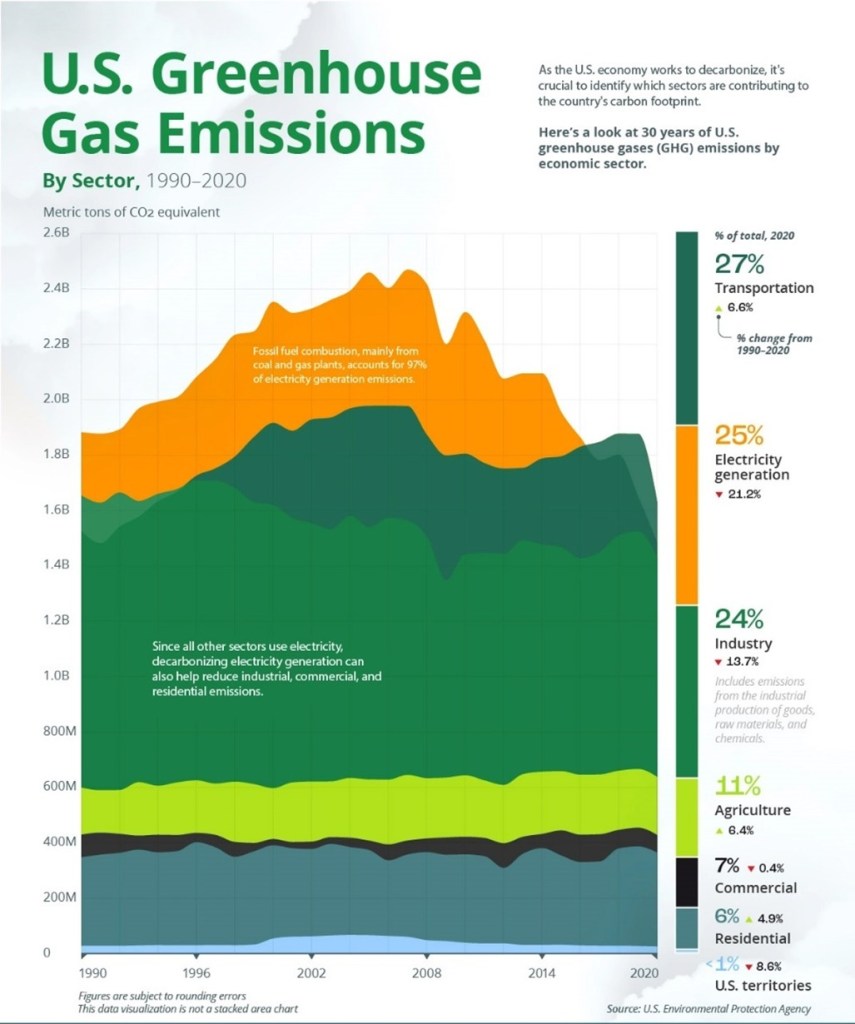 In the U.S., the production of greenhouse gases is distributed somewhat differently from the global average. Figure II.4 shows the release of GHGs over a 30-year span from 1990 to 2020. The GHG emissions are shown in billions of metric tons of CO2e. The percentage of each of the top 6 sectors of the economy is shown, as well as the percentage change in GHG emissions in that sector in 2020 relative to 1990. In 2020, the sector of the U.S. economy with the greatest release of GHGs was transportation, with 27% of total U.S. emissions. The second largest sector was electricity with 25%, followed by industry with 24%, agriculture with 11%, commercial with 7% and residential with 6%. It is interesting to note that in 1990, electricity was the largest sector; however, GHG emissions in that sector have declined by 21.2% in the past 30 years as coal-powered production has often been replaced by natural gas, while GHG emissions in the transportation sector have increased by 6.6% in that period. The increase in GHG emissions in the transportation sector reflects the fact that, relative to other developed countries, the U.S. has been very slow in converting from gasoline engines to hybrids or electric vehicles. In Section IV of this post we will discuss this in more detail.