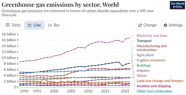 The structure of this post is as follows. In Section II, we will review the major sources of greenhouse gases and, hence, the major targets for mitigation. In Section III, we will discuss the replacement of fossil fuels with renewable energy sources, a transition where China is providing world leadership. In Section IV we will discuss the prospects for making a transition from traditional vehicles that rely on internal combustion engines burning fossil fuels to either hybrid electric or battery electric vehicles (EVs). In Section V we will review ways to reduce energy use and GHG emissions in the manufacturing and construction sectors of world economies.
