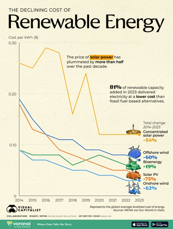 A major factor in the growth of renewables has been their dramatically decreasing costs. As indicated in Fig. III.3, the operating costs per kilowatt-hour for various types of wind and solar power production have decreased by factors between 2 and 4 over the past decade. The largest decrease has been for solar power from photovoltaic (PV) panels (down 75%), with onshore (62%) and offshore (60%) wind power not far behind in price decrease. Energy from concentrated solar power plants, where huge arrays of mirrors reflect sunlight to the top of collecting towers, has dropped in cost by 54%. These cost reductions already make renewable energy cost-competitive with fossil fuel energy. Indeed, 81% of renewable capacity added worldwide in 2023 delivered electricity at a lower cost than fossil fuel alternatives. Furthermore, ongoing research we have documented in a previous post will lead to significant efficiency improvements in both solar and wind power. In addition, reductions in the cost of storage batteries, which we document further in Sect. IV, enhance the storage of wind and solar energy for use when the sun isn’t shining and the wind isn’t blowing.
