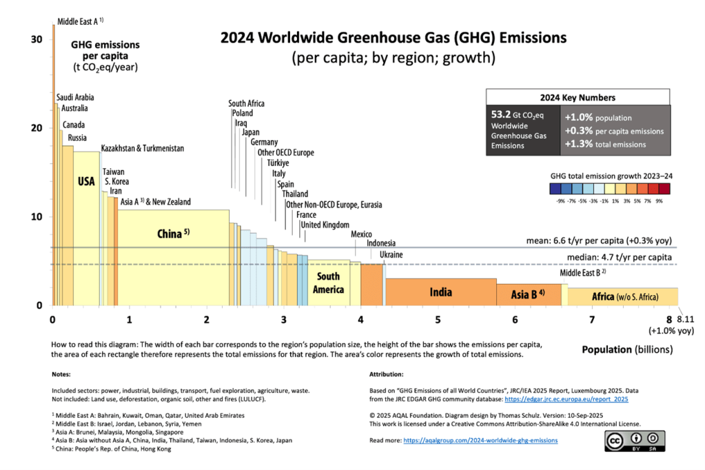 The U.S. produced about 18 tonnes GHG per person in 2024, roughly 6.1 billion tonnes of GHG released, or 11% of total global emissions. China produced about 10 tonnes GHG per capita, but when multiplied by the Chinese population of 1.4 billion, it produced a total of 14 billion tonnes of GHG in 2024, about 26% of global emissions, and the highest of any country (the U.S. was second). India produced about 5.5% of total global emissions. Globally, the mean per capita emissions of GHG were 6.6 tonnes/yr. Note that the 3.3 billion people living in the regions of the globe with the lowest per capita GHG released a total of about 0.7 tonnes of GHG, roughly 10% of the GHG released into the atmosphere by the U.S., and about 1% of total global GHG emissions.