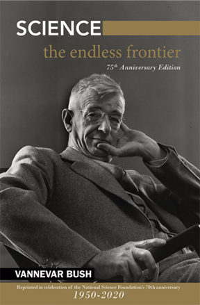 Figure I.2: Vannevar Bush and his 1945 report Science: The Endless Frontier. This special edition was reprinted in 2020 to mark the 75th anniversary of the National Science Foundation that was created as a result of Bush’s report.