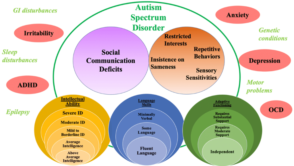 The current understanding of the broad autism spectrum disorder is then summarized in Fig. II.2. According to DSM-V the diagnosis of ASD depends on two core domains of symptoms. The social communication domain (purple circle in Fig. II.2) includes difficulties in both communication, social interaction, and interpreting social cues. The restricted and repetitive interests and behaviors (RRB) domain (brown circle in Fig. II.2) includes also a child’s insistence on sameness in behavior and environment and sensory sensitivities, such as oversensitivity to bright lights, loud noises, or strong smells. As indicated in the circles at the bottom of Fig. II.2, the autistic spectrum is now understood to encompass children with a very wide range of intellectual abilities – from severe disability to high but often narrowly focused intelligence – and language skills. There are three recognized levels of adaptive functioning and support needs, which are further elucidated in Fig. II.3.