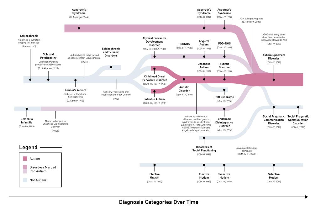 Figure II.1 provides a schematic illustration of how the diagnoses of various neuro-developmental conditions have changed during the 20th and 21st centuries, including how several conditions formerly treated as independent have been merged under the umbrella of autism spectrum disorder (ASD).