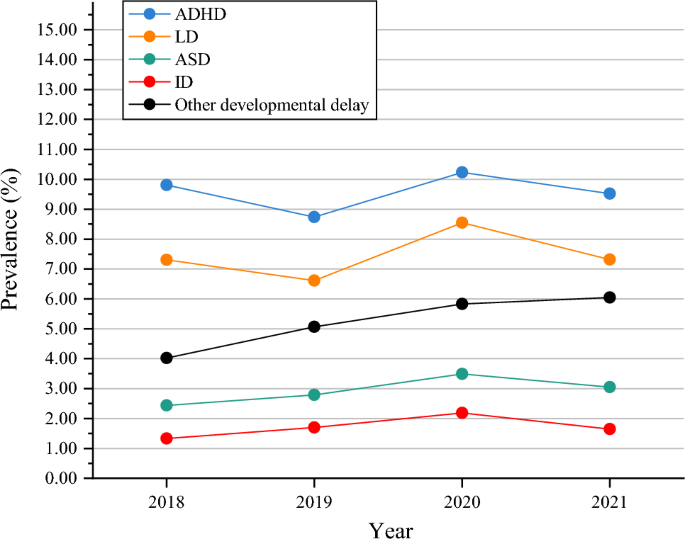 If an incidence rate of 3% or more for ASD among U.S. children seems alarmingly high, it is useful to consider the diagnosis in the context of incidence rates for other, sometimes overlapping, developmental disorders. A 2023 study investigated the prevalence of various developmental disabilities among U.S. children and adolescents, ages 3 to 17, during the years 2018-2021. The study’s results, shown in Fig. II.7, are based on data for 26,422 individuals available from annual National Health Interview Surveys. The categories in Fig. II.7 are not mutually exclusive; indeed, a fair fraction of the surveyed individuals have been diagnosed with two or even three of the conditions. But the overall prevalences of ADHD, learning disabilities, and other developmental delays are all significantly higher than that of ASD. Our understanding of neurodevelopmental anomalies is still at an early stage, but we have to come to terms with the fact that more than a tenth of American children are afflicted with them. And it does not appear from worldwide data that the U.S. is an outlier in this percentage.