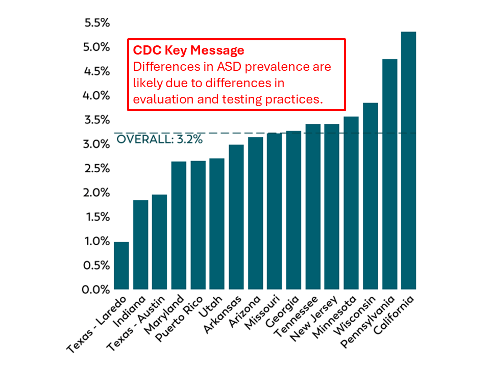 An additional significant contribution to the rise in autism prevalence comes from the introduction of more comprehensive screening. In 2007 the American Academy of Pediatrics recommended “universal autism screening during well-child visits at 18 and 24 months.” Many American parents have furthermore proactively sought autism testing for children whom they suspected would need access to special educational services. Still, the vigorousness in pursuing universal early autism testing varies significantly with location within the U.S. Figure II.6 shows the prevalence of ASD in 2022 among the sixteen U.S. monitoring stations of the Autism and Developmental Disabilities Monitoring (ADDM) Network. While 1 in 31 8-year old children were found to have ADS when averaged over the entire country, that ratio varied from 1 in 103 in Texas-Laredo to 1 in 19 in California. The Centers for Disease Control and Prevention attributes those differences to differences in evaluation and testing practices among the locations. For example, California has invested in comprehensive autism testing available at Regional Centers, including “assessing a child in multiple areas, such as communication, social skills, behavior, motor skills, and ability to complete daily tasks. An evaluation often includes interviews with the family, gathering medical and developmental history, observation and use of formal screening tools such as the ADOS-2. Research shows that identification and intervention lead to positive outcomes later in life for people with Autism.”