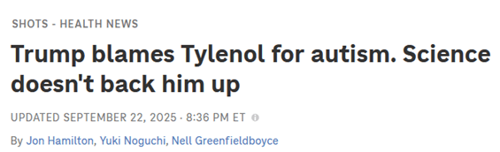 And finally, the Tylenol-autism claims represent yet another example of “blaming the Mom” for their child’s condition. A mother who took Tylenol during pregnancy and who gives birth to an autistic child, and who believes the falsehoods spread by Kennedy and Trump, will necessarily feel that she is responsible for this outcome, because she was not able to “tough it out” and refrain from taking this medication, even if her doctor recommended it.