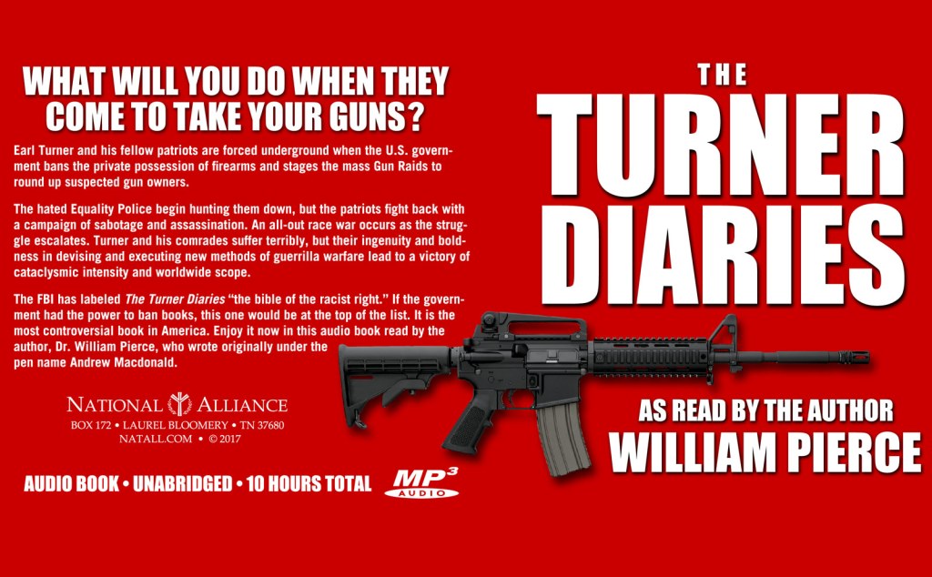One of the pieces of literature that strongly influenced Timothy McVeigh was the novel The Turner Diaries by Andrew Macdonald, a pseudonym of right-wing white supremacist and neo-Nazi William Luther Pierce. Excerpts from The Turner Diaries were found in McVeigh’s car when he was arrested following the terrorist bombing of the Alfred Murrah Federal Building in Oklahoma City. McVeigh had highlighted several passages from that novel.